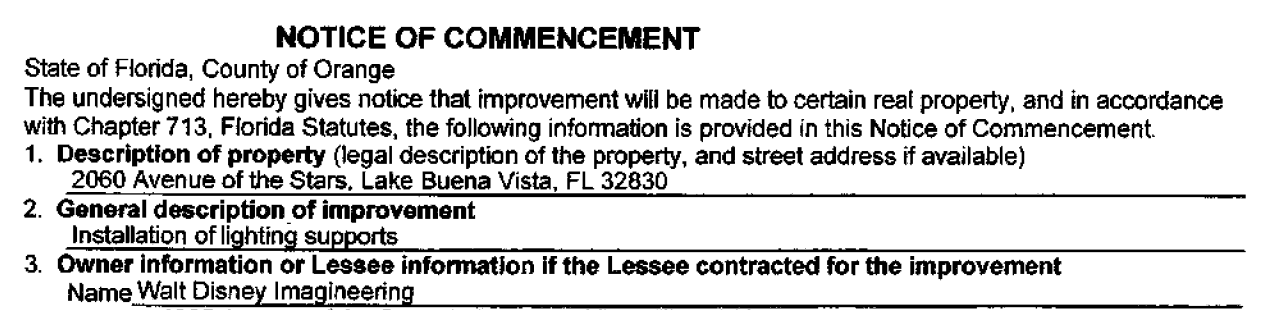 The second permit filed to the address is for the “installation of lighting supports” from InterAmerica Stage, Inc. This company has been seen on several structural and set permits for other Disney projects such as Guardians of the Galaxy: Cosmic Rewind.