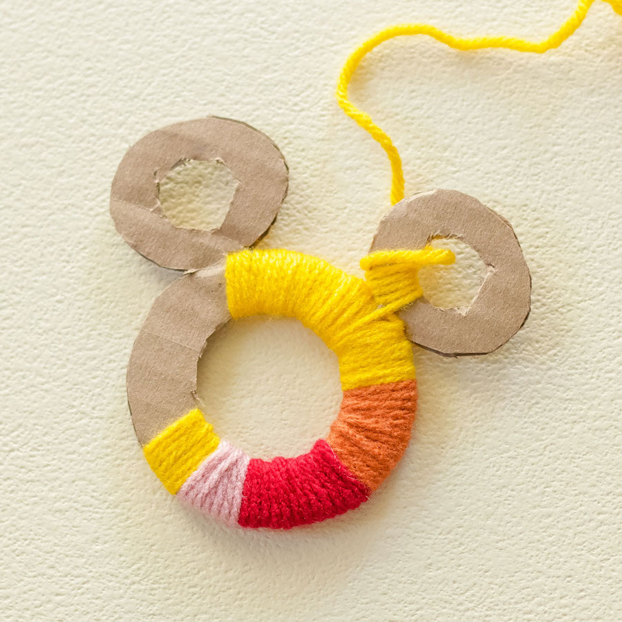 - Choose your first color of yarn and cut a piece about 12 inches long. Designate one side of your Mickey shape as the back and one as the front. Glue one end of the yarn onto the back, then start wrapping! Glue the other end down when you get to the end and start a new color.
