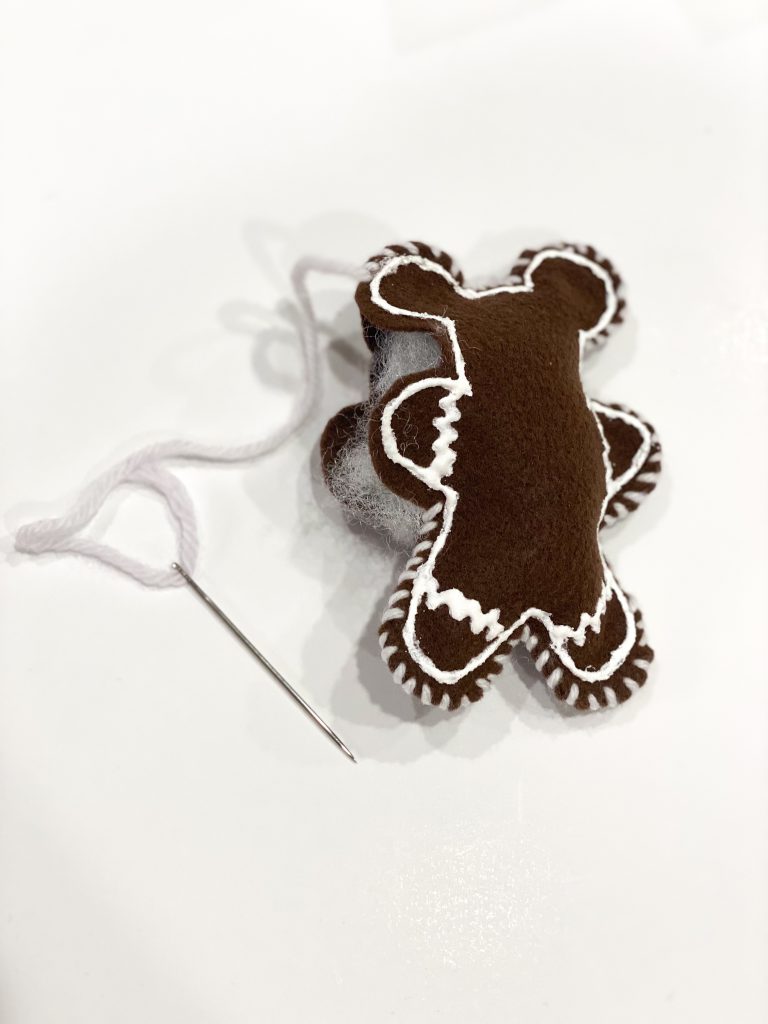 - Once your Gingerbread Mickey is dry, place it on top of your second Gingerbread Mickey. Using your needle and white yarn, carefully sew your two Gingerbread Mickeys together with a whipstitch. Before completely stitching up the Gingerbread Mickey, stuff with polyfill.