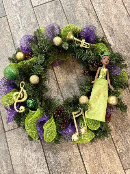 Next up is a gorgeous Princess Tiana Wreath! If you’re like us, the EPIC Christmas trees at Disney World have inspired us to step up our decor game at home, and this princess wreath is the PERFECT way!