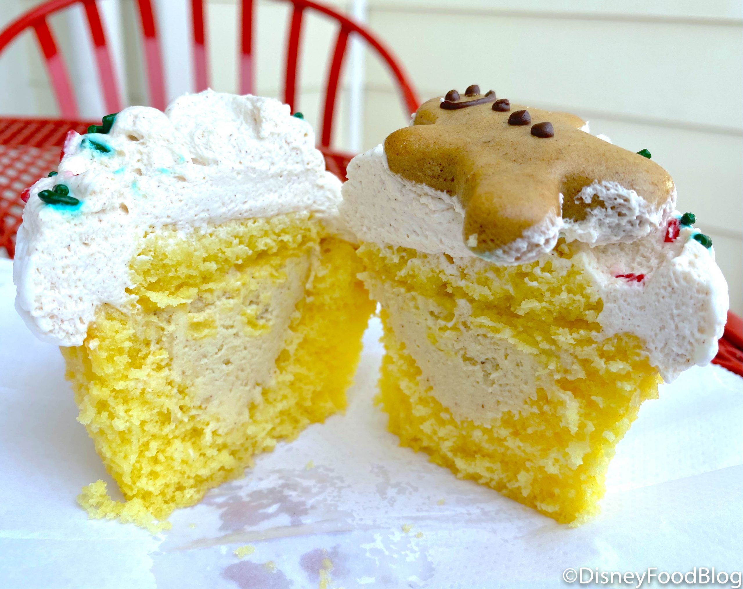 Fortunately, Disney World understands our spicy yearnings, and delivers with a veritable parade of endless gingerbread sweets. While we’ve certainly tried MANY gingerbread treats already, this latest arrival at BoardWalk Bakery earns bonus points by garnishing a cupcake with a cookie!