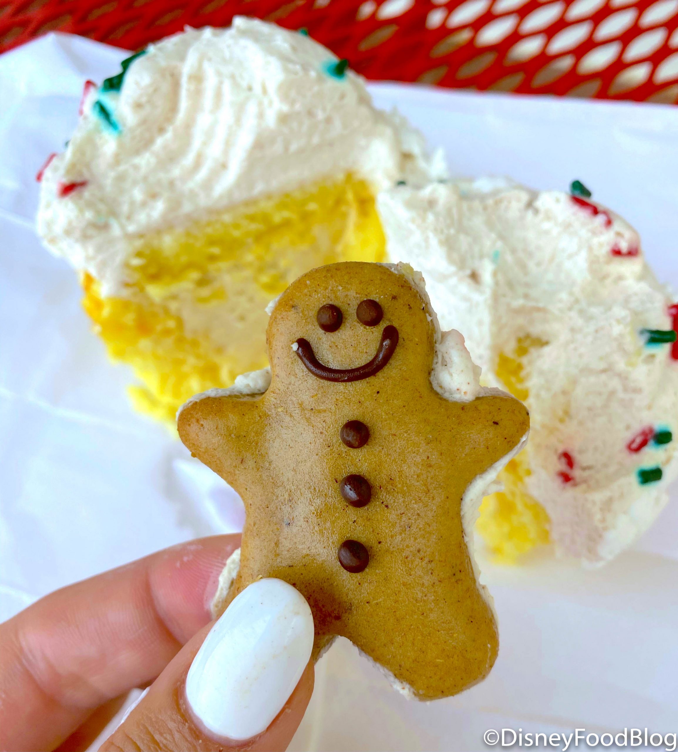 This is ESPECIALLY true of its festive flavors for the holidays! So far we’ve fallen in love with a salted caramel-gingerbread sandwich situation, gingerbread cupcakes topped with adorable polar bears, and chipmunk-approved gingerbread churros. Next up is a cupcake that’s both FILLED and TOPPED with gingerbread! The whimsy simply can NOT be contained!