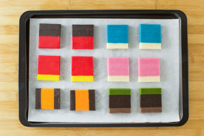 Step 2: Divide the dough into eight equal pieces. To make one strip of dough that is 7 inches long, 2 inches wide, and ½ an inch thick, you will need approximately ¾ cup of prepared cookie dough, which is one-eighths of this cookie dough recipe. According to the colors needed for one character, knead food coloring into the ¾ cup of dough until it is even throughout. Roll this dough into a 5-inch flattened log. Use a rolling pin to roll out the dough in between two square dowels, spaced 3 inches apart. If the dough sticks, use bench flour. Using a ruler and a sharp knife, trim the dough into a 7 x 2-inch rectangle.