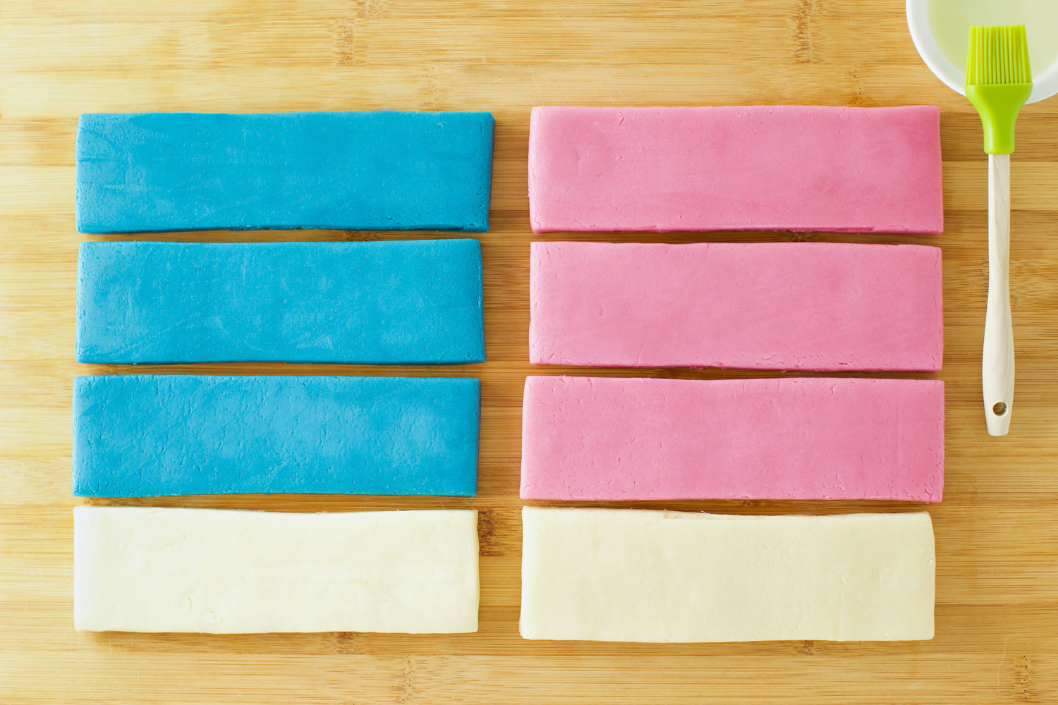 Step 4: For a Donald Duck-inspired cookie dough log, you will need three blue strips of dough and one white strip of dough. For a Daisy Duck-inspired cookie dough log, you will need three pink strips of dough and one white strip of dough. Each strip should be 7 inches long, 2 inches wide, and ½ an inch thick. Use a mixture of egg white mixed with water to “glue” four strips of dough together to make one character cookie log.
