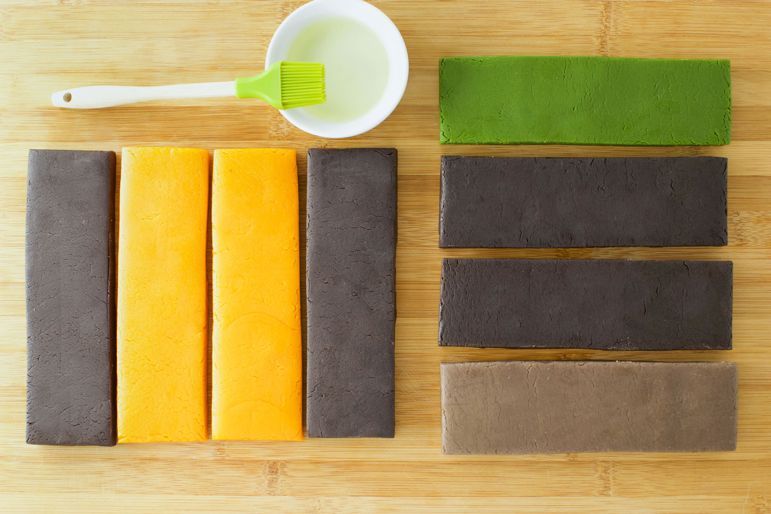 Step 5: For a Goofy-inspired cookie dough log, you will need one green strip of dough, two black strips of dough, and one gray strip of dough. For a Pluto-inspired cookie dough log, you will need two black strips of dough and two orange strips of dough. Each strip should be 7 inches long, 2 inches wide, and ½ an inch thick. Use a mixture of egg white mixed with water to “glue” four strips of dough together to make one character cookie log.