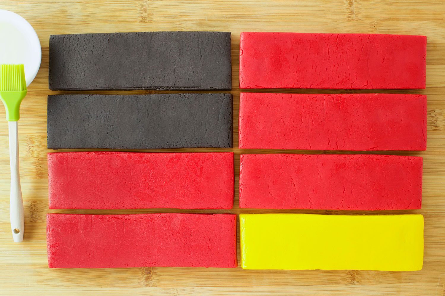 Step 3: For a Mickey-inspired cookie dough log, you will need two black strips of dough and two red strips of dough. For a Minnie-inspired cookie dough log, you will need three red strips of dough and one yellow strip of dough. Each strip should be 7 inches long, x2 inches wide, and ½ an inch thick. Use a mixture of egg white mixed with water to “glue” four strips of dough together to make one character cookie log.