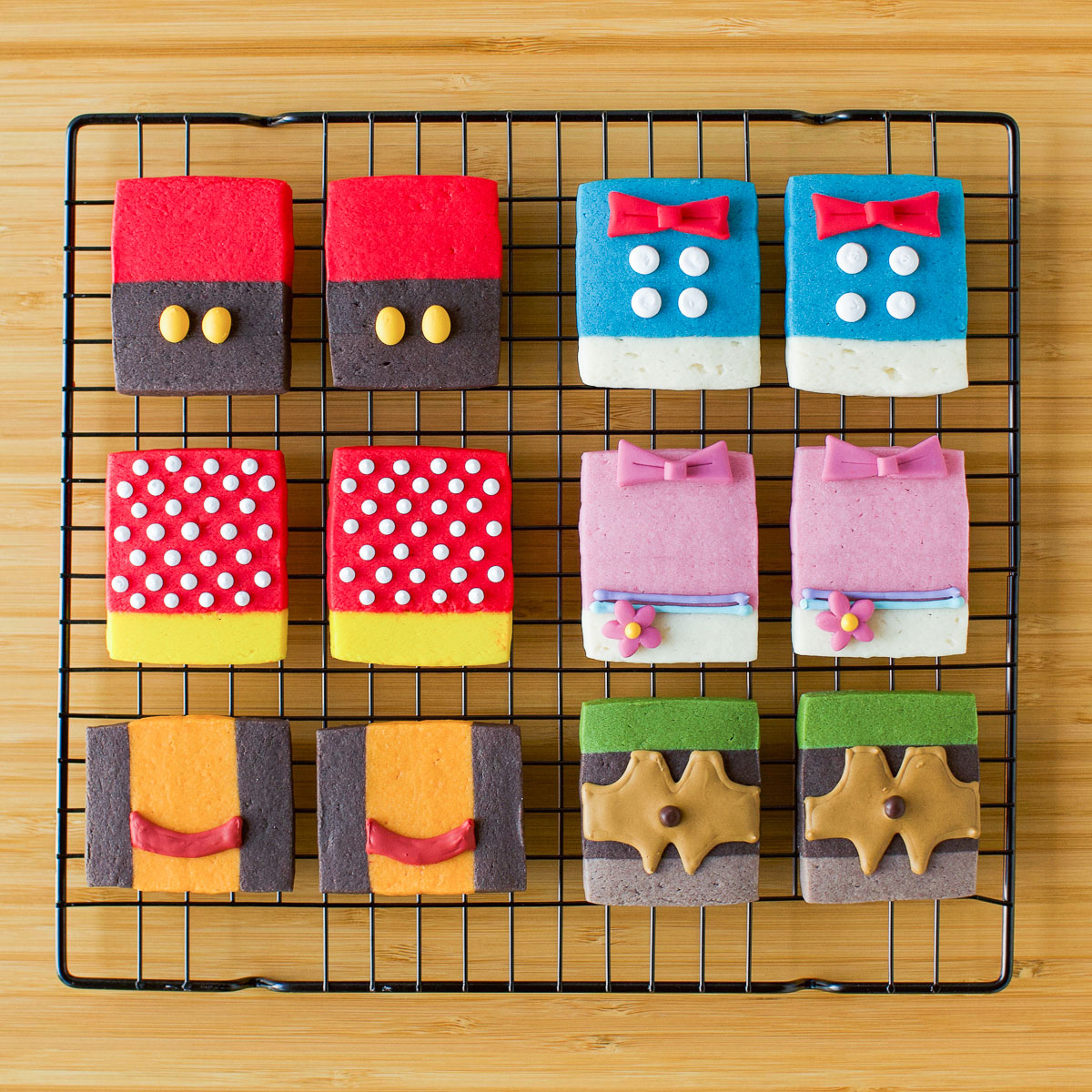 Step 9: After the cookies have cooled completely, decorate them with tinted royal icing fitted into piping bags. For Mickey, pipe two yellow royal icing dots. For Minnie, pipe many white royal icing mini dots. For Donald, pipe white royal icing buttons & attach a bowtie cut from red fondant. For Daisy, pipe turquoise and lavender royal icing lines. Attach a bow and a daisy made from pink fondant. For Goofy, use tan royal icing to pipe his vest, and attach a chocolate dot or chip for his button. For Pluto, pipe a red royal icing collar.