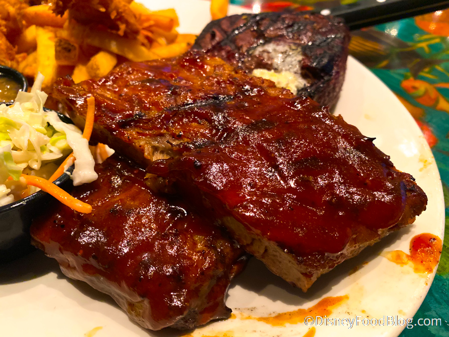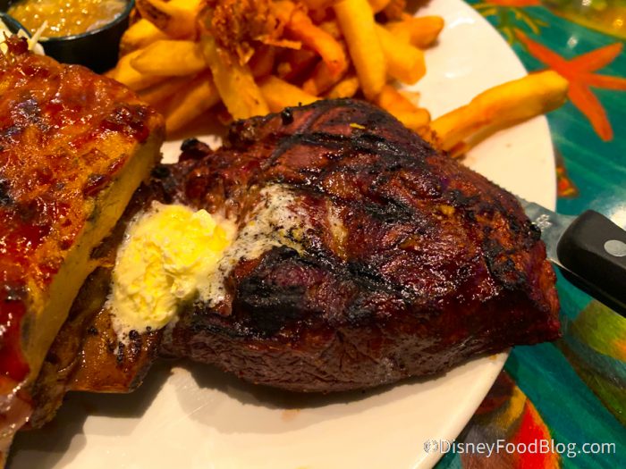 The steak, though, left us feeling underwhelmed. It’s not a very good quality cut of meat, and it just tasted so-so. It was cooked fine, though, so we’ll give Rainforest Cafe that. And we did like the slab of butter on top. Even on the plate, the steak looked a lot less appealing than the coconut shrimp and ribs. Sorry, little guy. You tried.