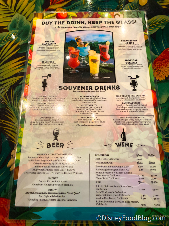We started with the drink menu, which features cocktails where you buy the drink and keep the glass. Note: you can still order any of these drinks and specify you don’t want the souvenir glass, so keep that in mind if you’re looking to save a few bucks. And that’s the case with kid’s drinks, too, which also come with pricey glasses.