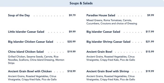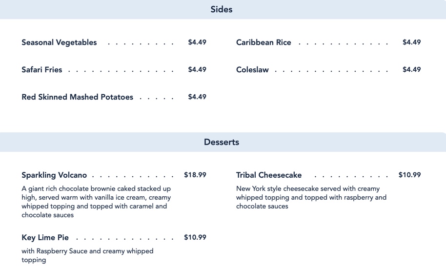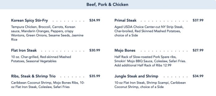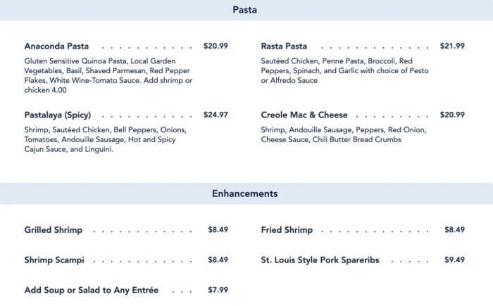 Pasta gets its own section as well. You can add on “Enhancements” here to any meal. At a few Signature Restaurants around Disney World, this is an option for an upscale side item typically. Here, it’s mostly an overpriced option to add on extra protein to your meal. It is interesting to be able to order a side of ribs to go with your meal though!