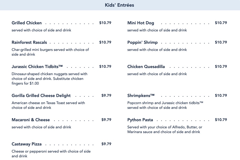 We’ll never complain about the theming at Rainforest Cafe because it really is a lot of fun, and that’s saying a lot coming from us because we spend most of our days at Disney restaurants! We can’t imagine kids not loving this place just for the atmosphere. This is a spot parents may have no choice but to visit if it catches their kid’s eye. We know our kids have begged us to eat here before — the appeal of eating in a giant firey volcano full of screaming animals is like catnip to many kids!!