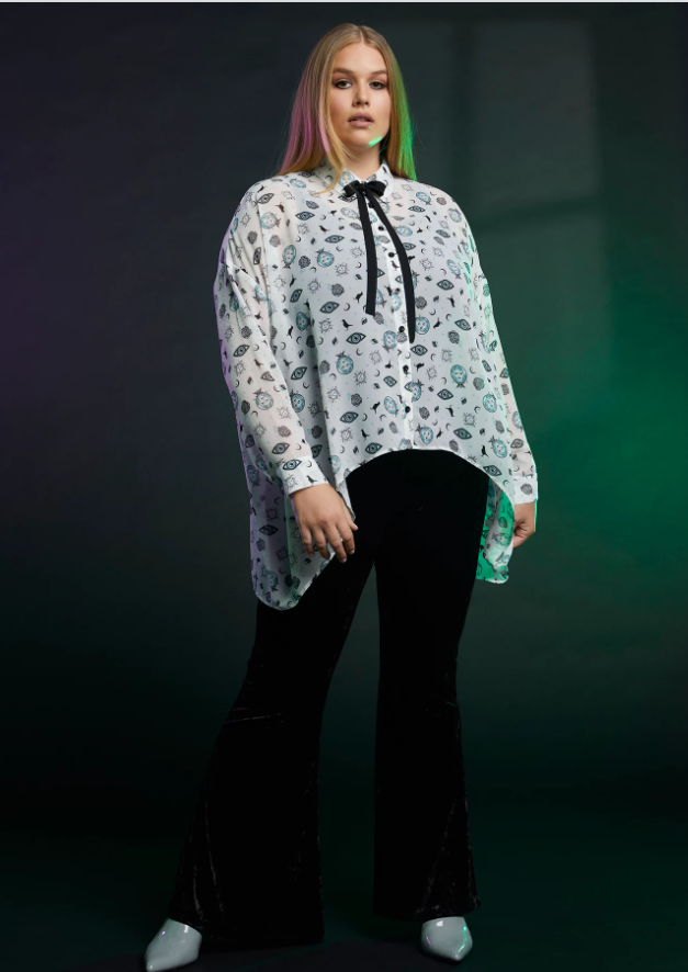 First up on the list is the Madame Leota Bow Tie Hi-Low Button-Up in plus sizes. The bow tie is removable, and the shirt is made of a chiffon fabric with a print of Madame Leota and her various symbols.