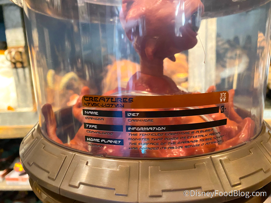 And we discovered a brand new creature there today! This one is a Dianoga Doll, which is a one-eyed tentacled beastie best known for its appearance in the trash compactor scene of Star Wars: A New Hope. But you can also spot it in Star Wars: Galaxy’s Edge near the water fountains!