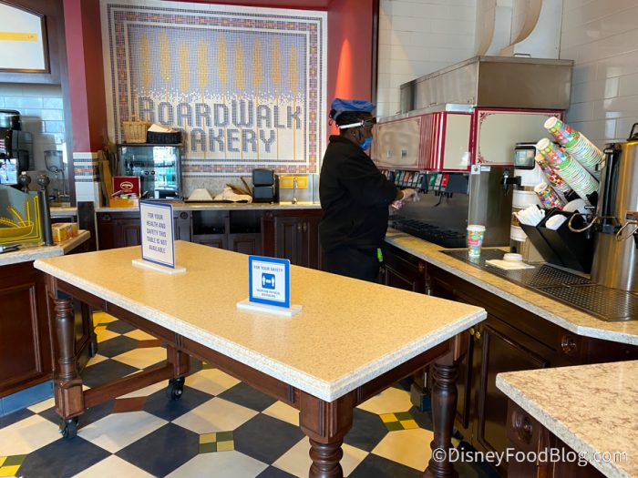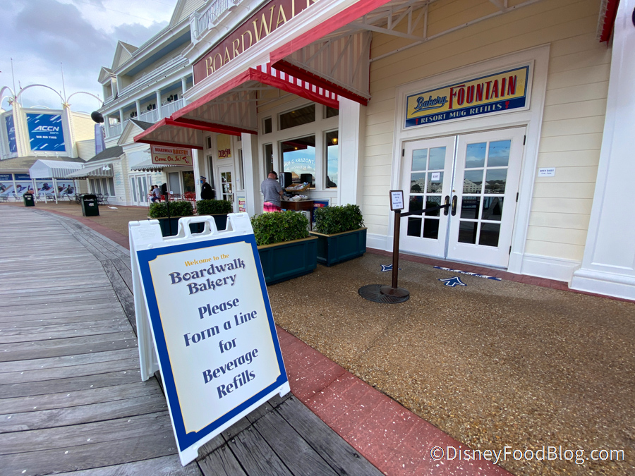 We noticed some of these changes recently at BoardWalk Bakery located on Disney’s BoardWalk — there’s a brand new set-up for the refillable mug station there. There’s new signage out front directing guests to the line for beverage refills on the right.