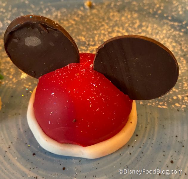 We started with the cute little Peppermint Mickey Dome. The peppermint flavor came from little bits of flavored white chocolate inside the mousse, which gave it a light peppermint taste that blended well with the chocolate.