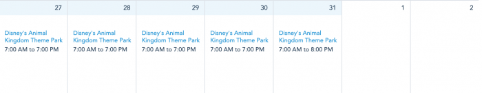 Finally, Disney’s Animal Kingdom will be open from 7AM-7PM on December 28th through December 30th. Like the other three parks, Animal Kingdom will be open one hour later on New Year’s Eve, from 7AM-8PM.