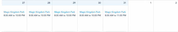 Starting at Magic Kingdom, the park will be open from 8AM-10PM on December 28th through December 30th. On New Year’s Eve, Magic Kingdom will be open from 8AM-11PM.