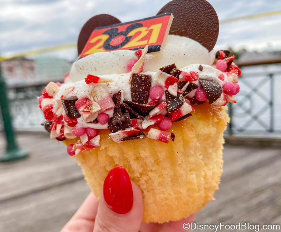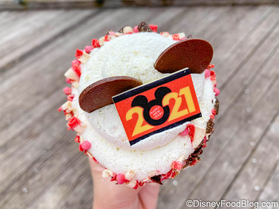 Here to celebrate the New Year, the cupcake is topped with Mickey ears, a 2021 decoration, crispy pearls, and white chocolate shavings around the edge. It’s honestly super cute!