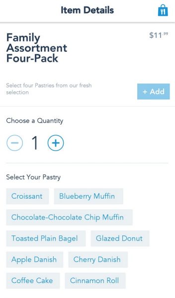 You get your choice of two pastries for $6.49 or four for $11.99 from nine options. Take you pick from a Blueberry Muffin, Croissant, Chocolate-Chocolate Chip Muffin, a Toasted Plain Bagel, Cinnamon Roll, Coffee Cake, Cherry Danish, Apple Danish, or a Glazed Doughnut.