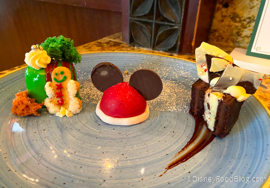 Did you think we were done with Christmas treats?? Guess again! We found a Holiday Trio dessert special from Nomad Lounge so we had to give the treats a try! The special comes with a Gingerbread Mousse, a Peppermint Mickey Dome, and a Black Forest Cake. Fair warning: these desserts were SWEET, but we did enjoy having another holiday snack!