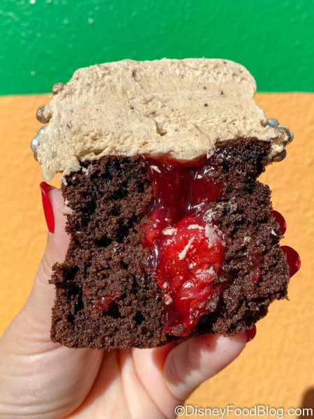 As far as flavors go, it’s made with chocolate cake, amaretto frosting, and a cherry filling, which sounds like a pretty unique combination from what we’re used to seeing! The chocolate cake was very moist and the cherry filling is very similar to what you’d find in a pie, with whole cherries on the inside.
