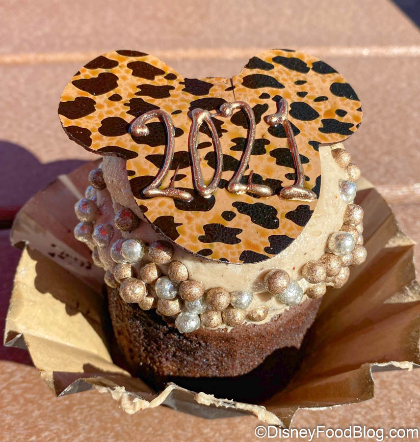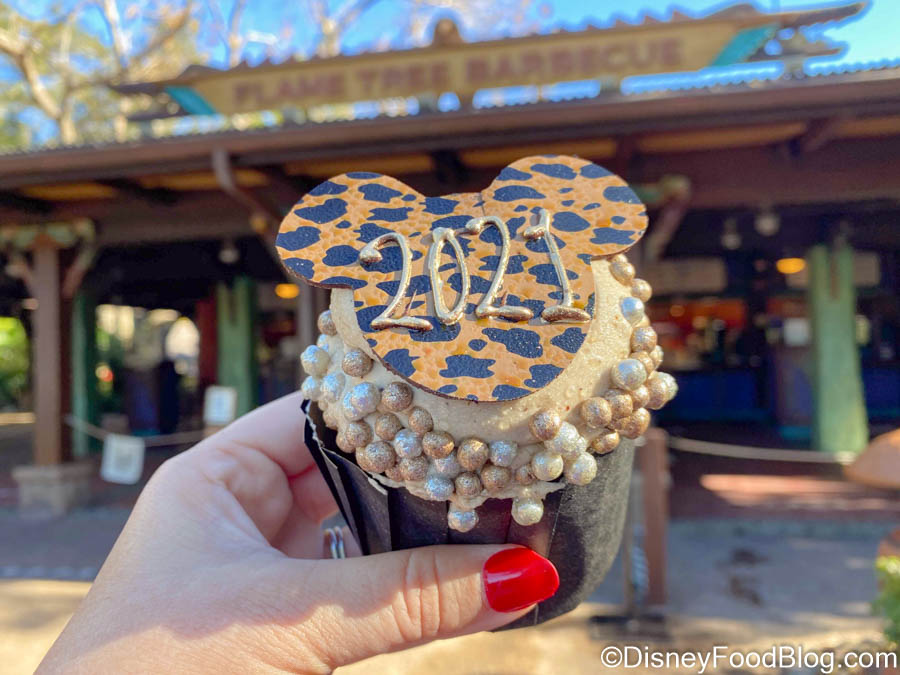 With 2021 just around the corner, we’re gearing up to visit EPCOT’s Festival of the Arts, try out the modified Park Hopping, and see what’s going on with MagicBands. However, since we’re a food blog, one of the things we’re most excited to check out is all the holiday snacks! Today, we stopped by Animal Kingdom to pick up the New Year’s Eve Cupcake!