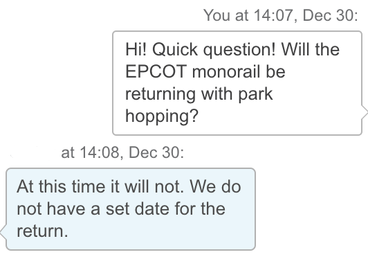 We weren’t sure whether the EPCOT routes would return with park-to-park transportation, but according to the Cast Member, we will not be taking the highway in the sky to EPCOT on January 1st. At this time, there is no set date for the return.