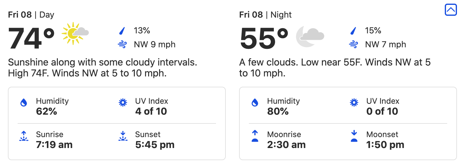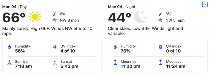 Plus, you’ll spot that low alllllll the way down at 44 degrees. That’s chilly! Bring a sweater so that those evenings and nights don’t leave you shivering.