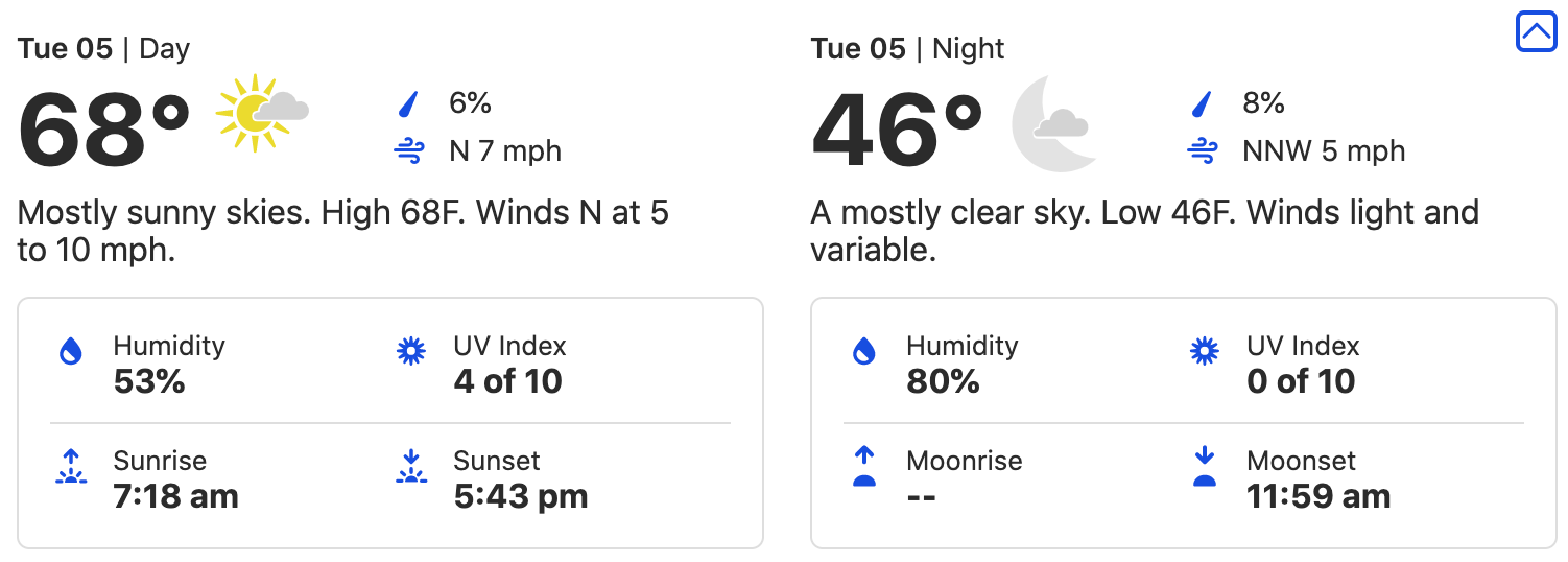 The low stabilizes too, landing in the mid-50s. You might be hot during the day to be cold late at night so layering will be key!