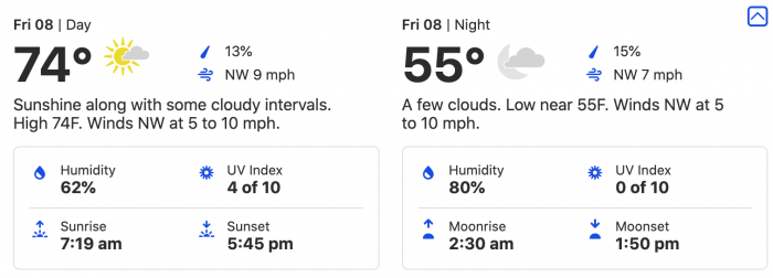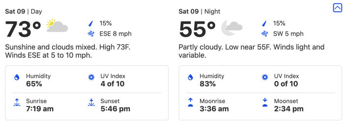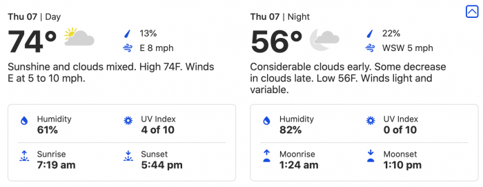 Here, we’re looking at a 73-degree high and a 55-degree low.