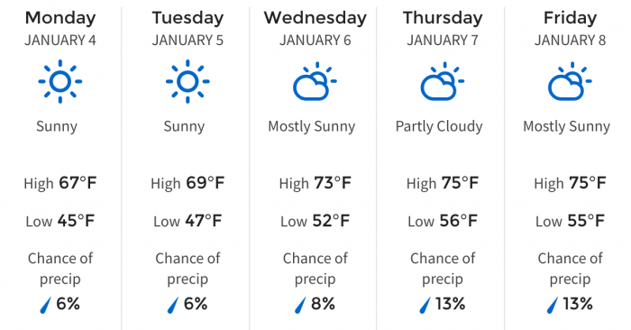 And we’ll wrap up our week on January 10th with those temperatures sitting at a comfy and similar 74-degree high and a brisk 56-degree low.