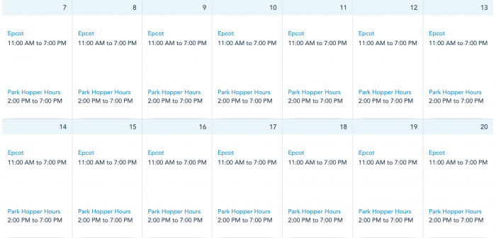 Hours remain the same for EPCOT as well. This park will be open from 11AM to 7PM with park hopping hours from 2PM to 7PM.