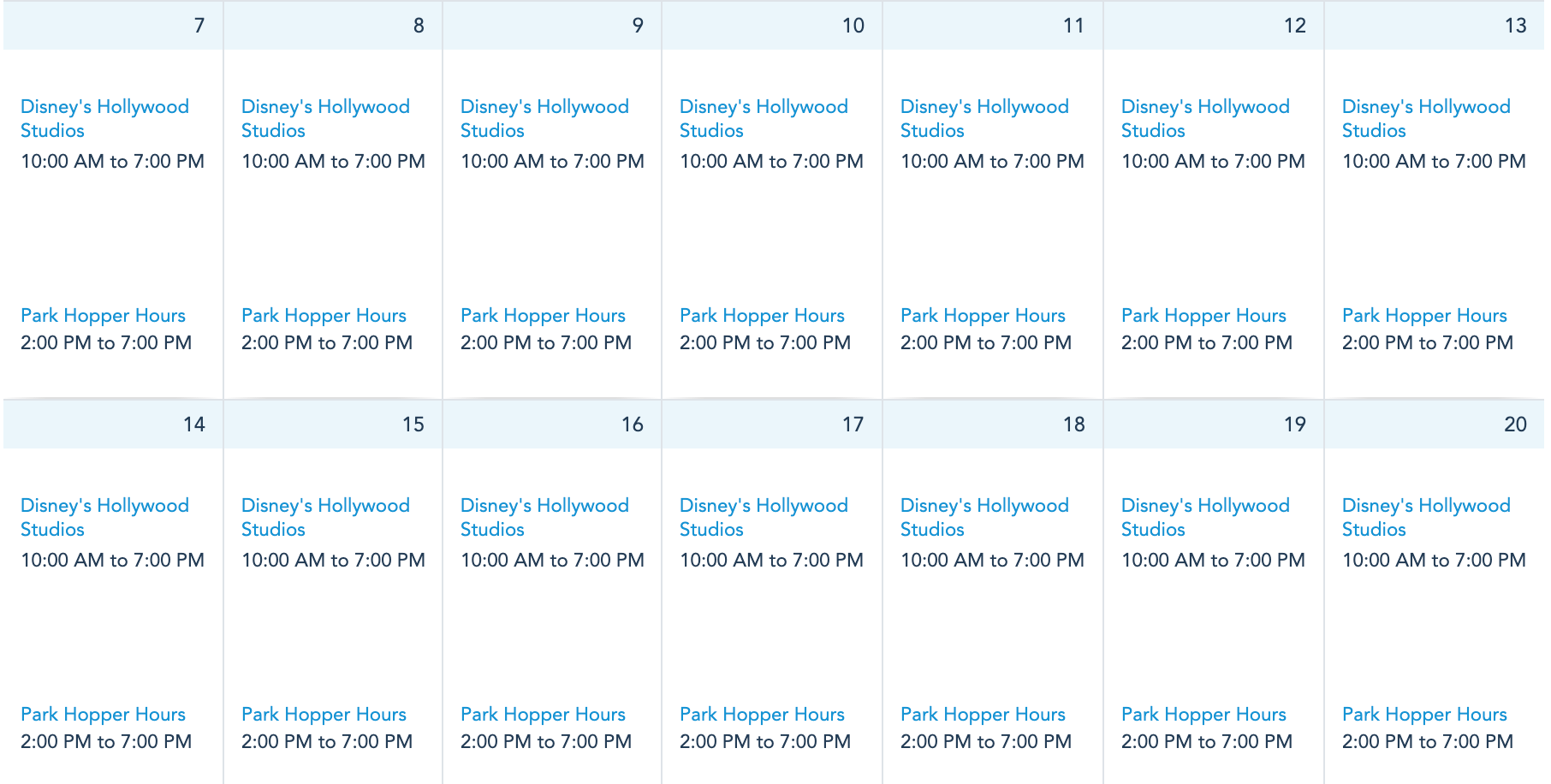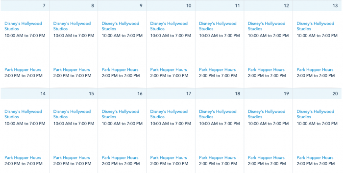 Disney’s Hollywood Studios continues with hours of 10AM to 7PM and park hopping hours from 2PM to 7PM.