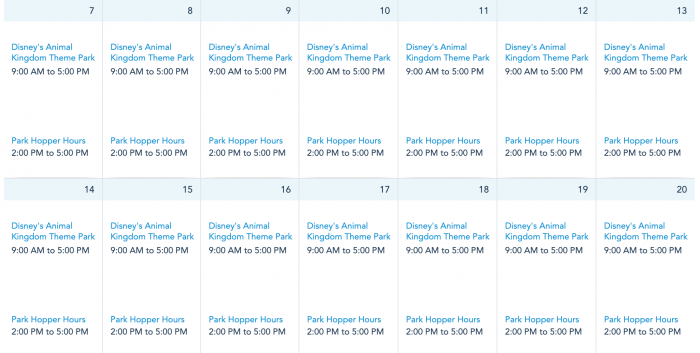 And finally, Disney’s Animal Kingdom will see a continued pattern of hours as well. The park will be open from 9AM to 5PM with park hopping hours from 2PM to 5PM.