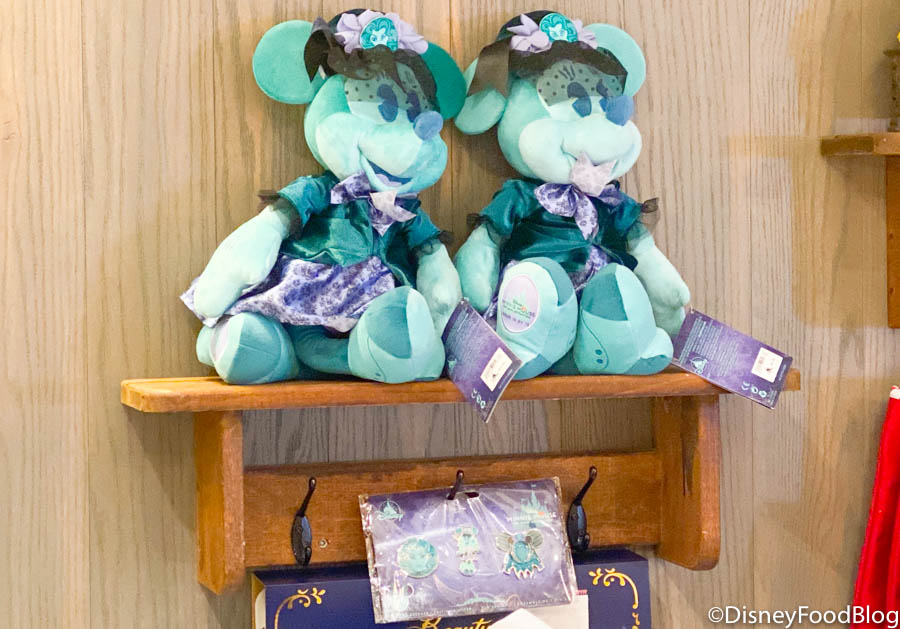 We were checking out the latest at Sir Mickey’s in Magic Kingdom’s Fantasyland when we noticed a SUPER limited display of Haunted Mansion items — as in literally two Haunted Mansion Minnie Plushes and one Haunted Mansion Pin Set.