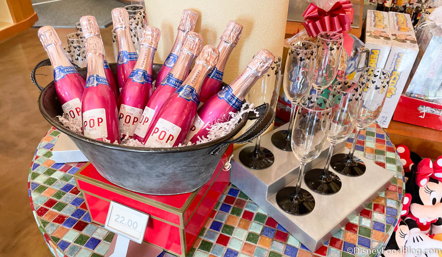 Finally, on the merchandise side of The Artist’s Palette, we spotted some cute little bottles of Champagne for $22 — displayed next to Mickey champagne flutes of course!