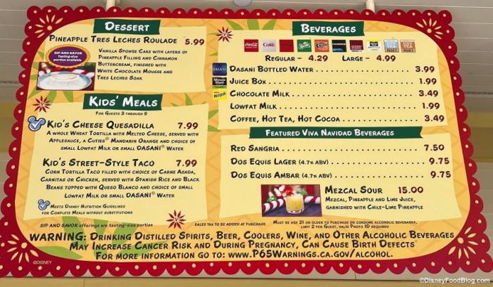 - Kids’ Street-Style Tacos – Corn tortilla taco filled with choice of carne asada, carnitas, or chicken served with Spanish rice and black beans topped with queso blanco and choice of small lowfat milk or small DASANI Water – $7.99