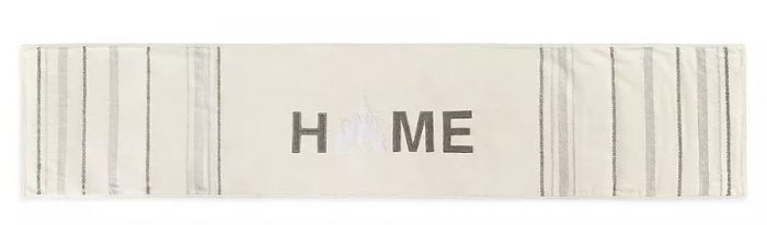 The all-cotton table runner is tan with a series of stripes, and has the word “Home” on it with Cinderella Castle portraying the “O.” There really is no place like home!