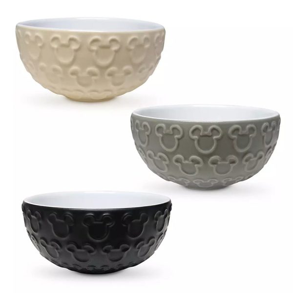 For $34.99, you get three bowls in three different colors — white, tan, and black. The ceramic bowls feature a pattern of raised Mickeys on the outside with a Mickey icon on the inside bottom.