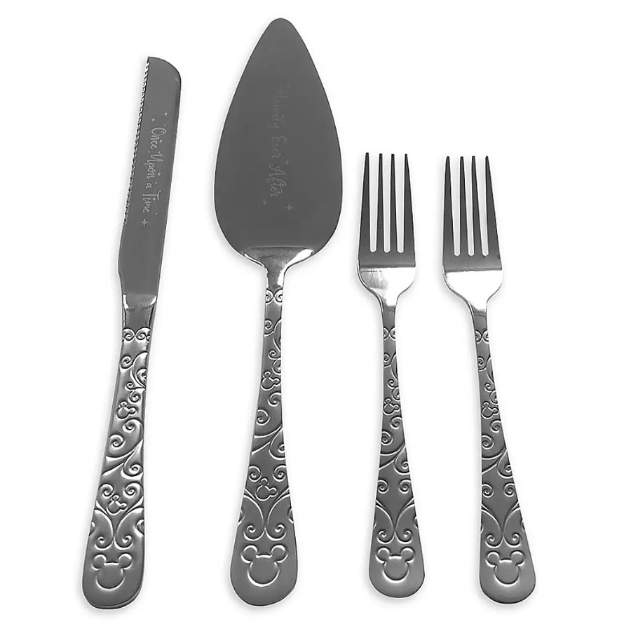 When it comes time to cut and serve the cake, do it in style with this Mickey Mouse Icon Cake Serving Set, which features two forks, a knife with “Once upon a time” engraved on its blade, and a cake server with “Happily ever after” engraved on its blade.