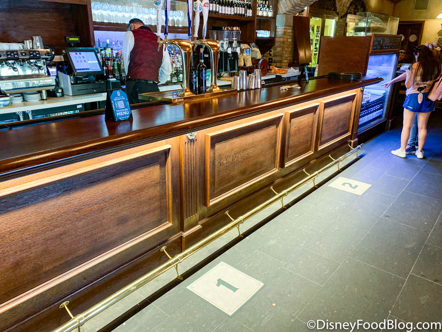 To grab yourself an Italian cocktail as you walk around EPCOT, enter through Tutto Italia. There are two separate lines in this area, the left is for dining and the right is for the bar, so you’ll want to be sure to find the right one. Once you’re up to the front of the line, let one of the Cast Members know you’d like to go to the bar and they’ll direct you when there’s room.