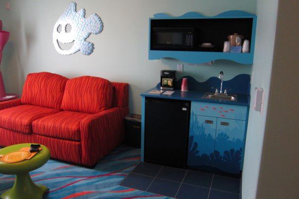 There are so many fun details in these rooms, from the ocean-based color scheme and art in the Finding Nemo suites to the toolbox dressers and traffic cone lamps in the Cars suites.