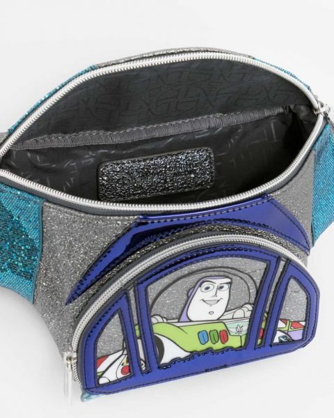 This snazzy bag features Buzz front and center, with sparkly blue and silver colors. The strap even resembles Lightyear’s wings, so you can blast off into space! The bag includes two zipper pockets, making it spacious enough to bring the theme park essentials.