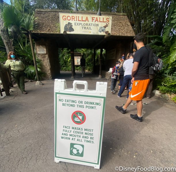 On the trails at Disney’s Animal Kingdom, you’ll find a number of social distancing markers and lines, particularly in areas like the Gorilla Falls viewing area as the number of guests being allowed into that area at any one time is being limited.