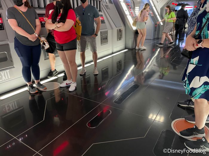Inside the actual attraction, there are various pre-show areas, all of which previously had some measure of social distancing markers and/or plexiglass.