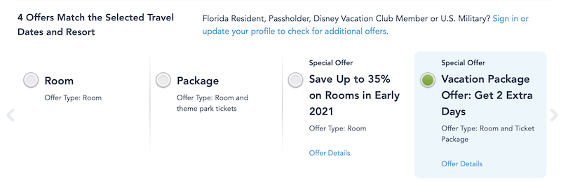 Now, the special offers tab was a little weird with us this morning. When we went to click on the offer from the special offers page on the Disney World website, we were redirected to the Disney Springs page. But, once we went to book a room, we were able to choose the FREE ticket offer as a discount option.