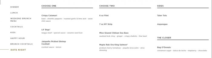 The appetizers you can choose from include: Crispy Calamari, Lil’ Brgs, or Jalapeno Pickled Shrimp Cocktail. Each diner can pick one of four entrees: a 6-ounce Filet, a 7-ounce New York Strip Steak, Miso Glazed Chilean Sea Bass, or Maple Rub Ora King Salmon. The included sides are Tater Tots and Asparagus, and you finish things off with STK’s Bag O’Donuts!