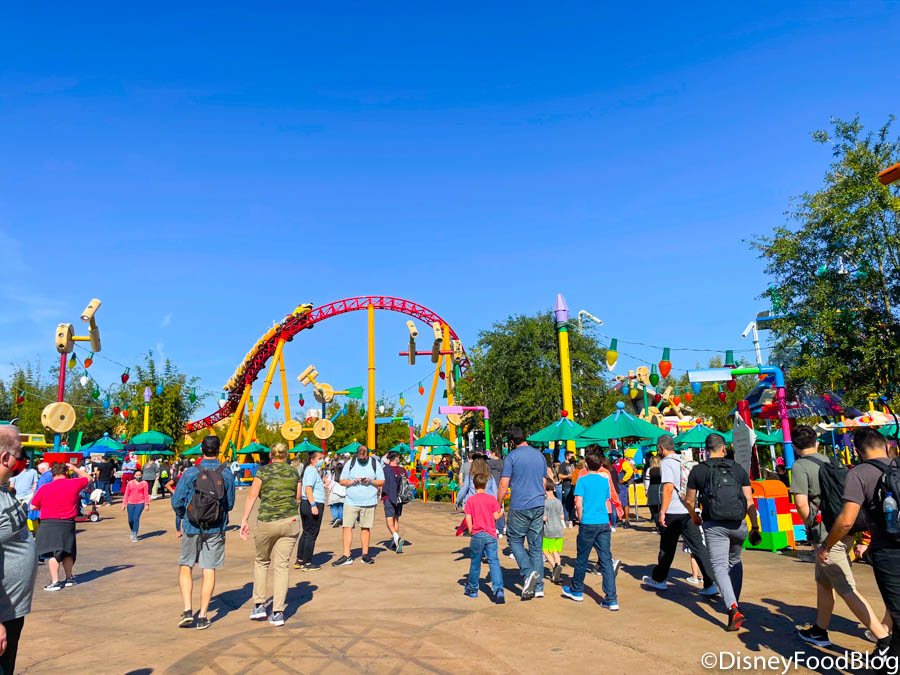 Toy Story Land is pretty poppin’ as well. You really have to be paying attention as you walk through here to keep six feet away from other guests.
