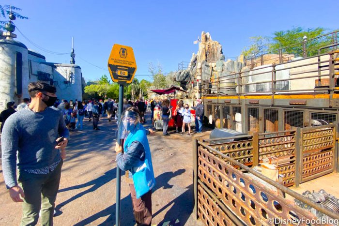 Let’s start with an undeniably high-demand area of the park, it’s Star Wars: Galaxy’s Edge! This area had a lot of folks moving through, which is typical since the reopening. We spotted that Millennium Falcon: Smugglers Run had a wait of 80 minutes when we passed this morning.