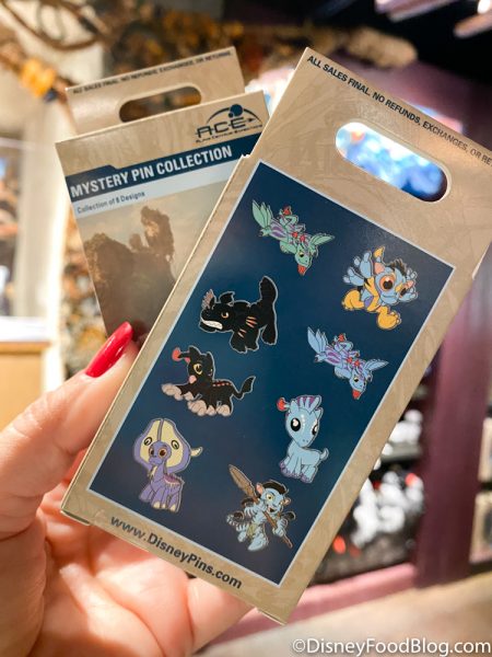 New Pandora pins have appeared in Animal Kingdom! We spotted the new Avatar pins in Pin Traders and Island Mercantile. The large pin on top is $19.99, featuring the banshees and mountains. The bottom two are $9.99 each and feature the Avatar “A” logo and the Floating Mountains.